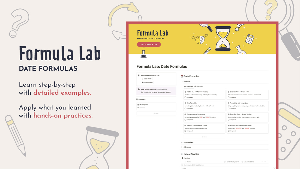 Formula Lab is a comprehensive study guide to learn Notion formulas. It is an interactive and informative guide, designed to make learning formulas enjoyable and effective.